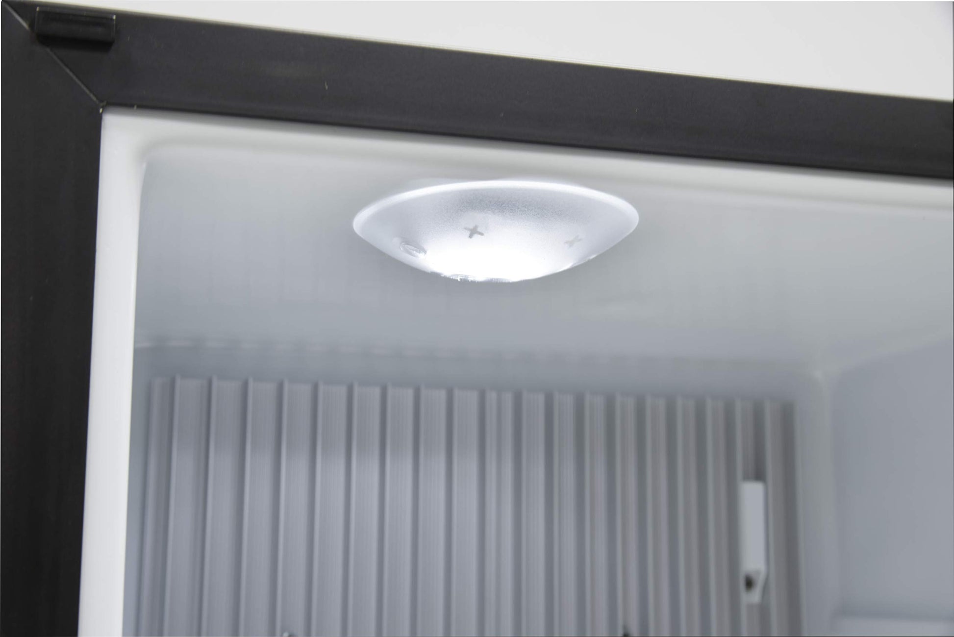 Cuenta con una puerta de cristal que permite visualizar fácilmente el contenido, además de una luz interior LED de bajo consumo que facilita su uso incluso en entornos con poca iluminación. La temperatura es ajustable, y el sistema auto-defrost ayuda a evitar la acumulación de escarcha.