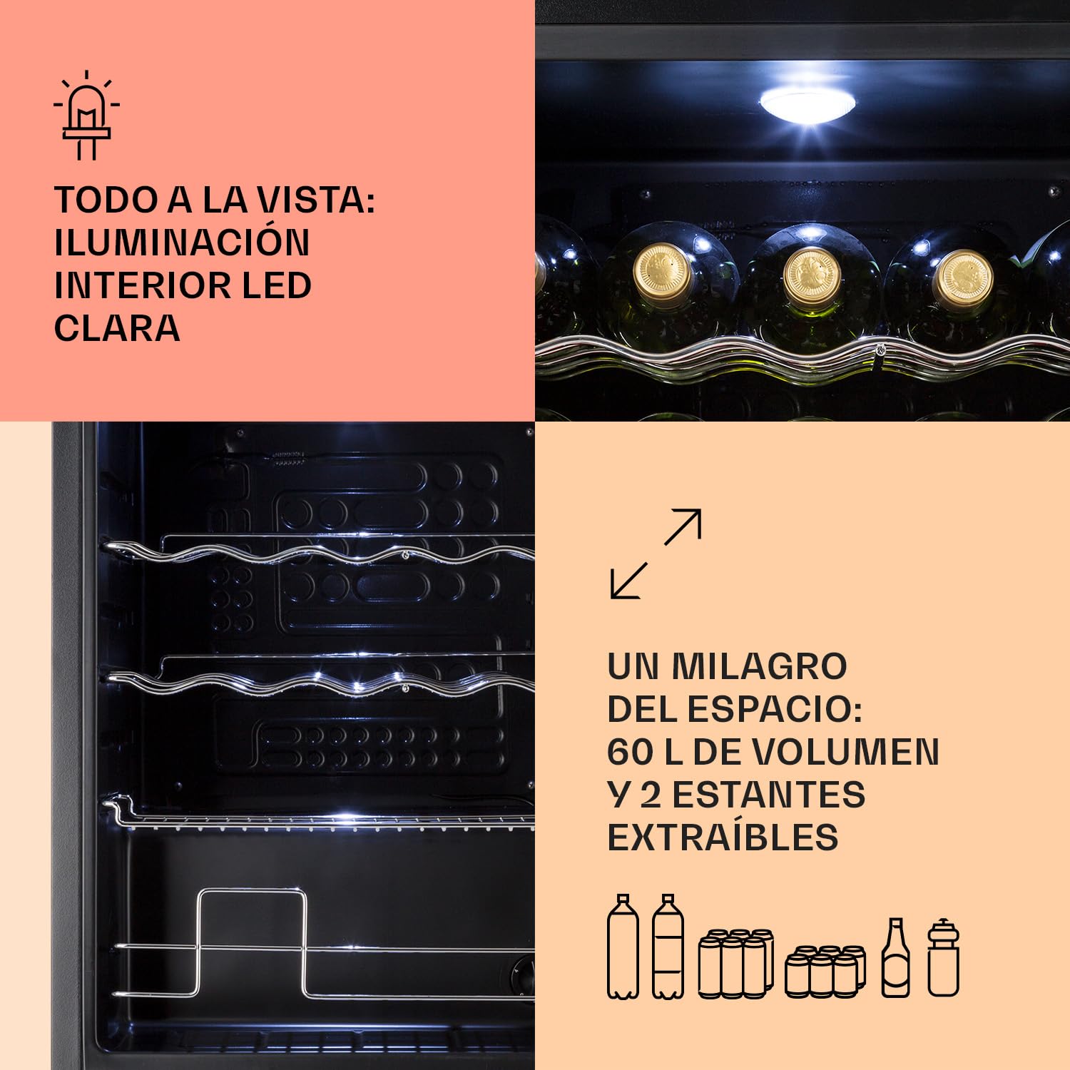La KLARSTEIN Mini Nevera de 60 litros es la aliada ideal para mantener tus bebidas frías y bien organizadas, ya sea en casa, en fiestas, en una caravana o en tu oficina. Con un diseño moderno y elegante, esta nevera portátil con puerta panorámica de cristal y frontal de acero inoxidable no solo enfría, sino que también luce espectacular gracias a su iluminación LED interior.